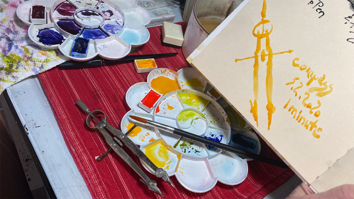 Fun week, adding watercolor to a few of the scribbles as well as doing the above scribble using only a brush and one pigment, varying the line and consistency of the pigment with each stroke. Notice how the change in value as well as the descriptive shape of each stroke creates a feeling of dimension without actually drawing it. The linear lines, accented by the ovals and circles creates motion through and around the strokes describing the compass.